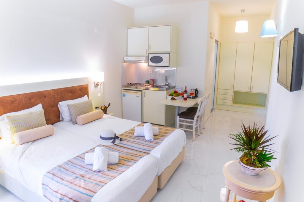 Type of beds – double or twin, extra bed – sofa, mini-fridge, equipped kitchenette, safe (extra charge), individual A/C (extra charge), WiFi, bathroom, hairdryer, balcony or terrace